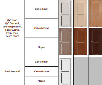 Скло: В моделях дверей зі склом використовується 4 мм скло. Воно може бути сатинове (за склом злегка видно силует): сатин білий, сатин, бронза. Або лакобель чорна - фарбоване скло в чорний колір, воно взагалі не пропускає світло і силует.